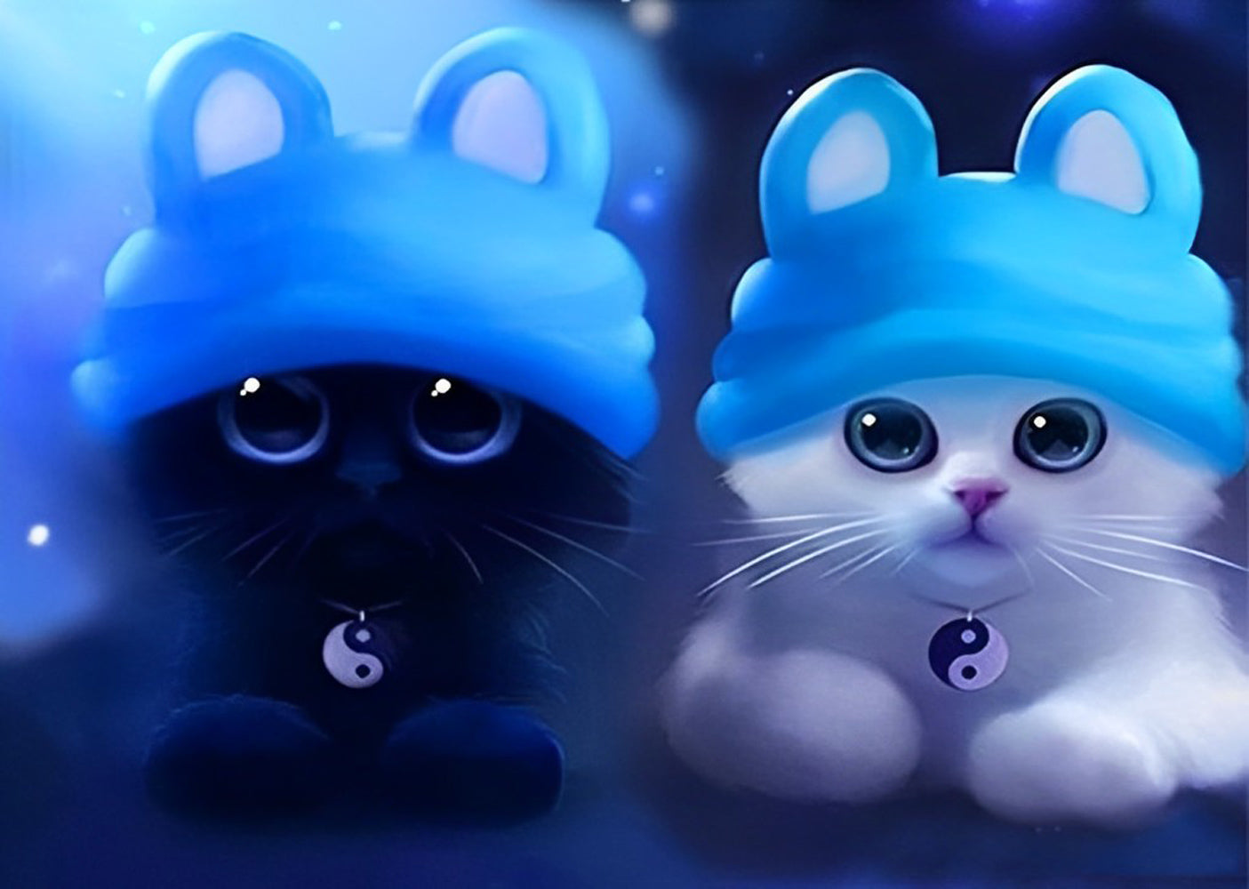 Zwarte en Witte Katten met Blauwe Hoeden Diamond Painting