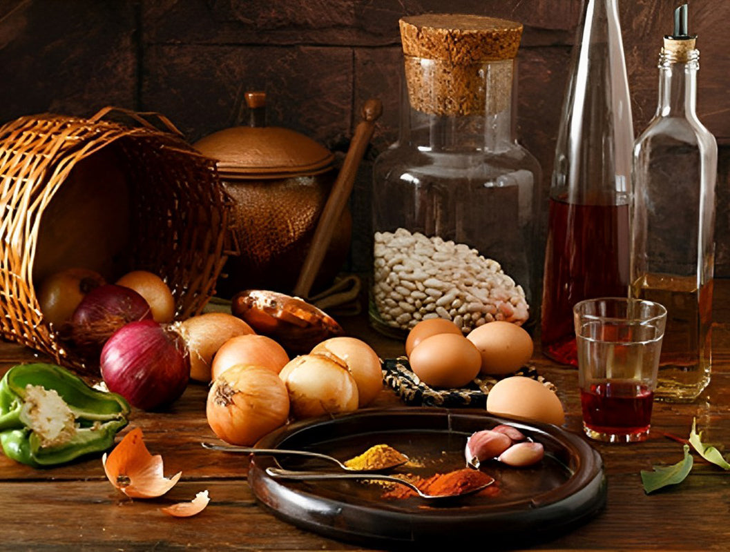 Ui, Kruiden en Flessen op een Houten Tafel Diamond Painting