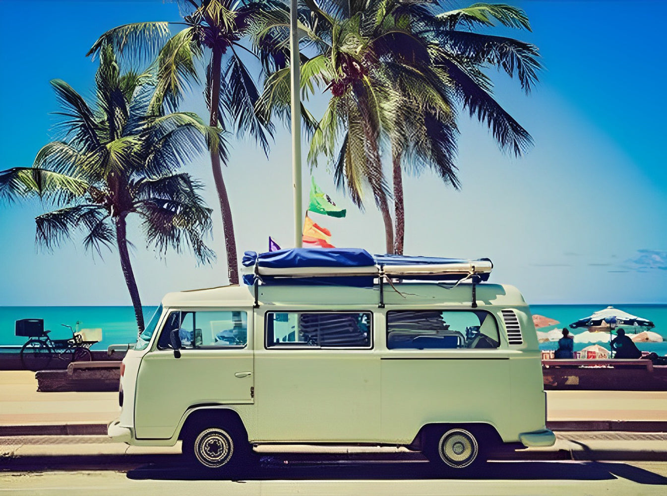 Witte Bus met Surfplank aan Tropische Kust Diamond Painting
