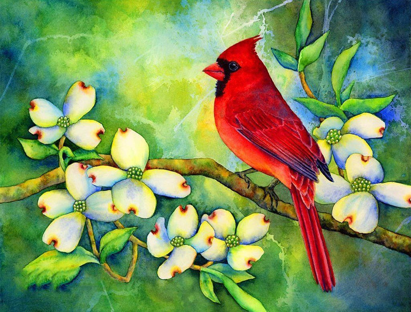 Witte Bloemen en een Noord-Amerikaanse Kardinaal Diamond Painting