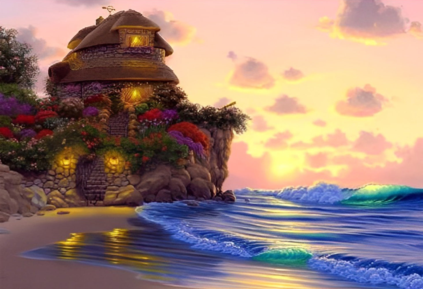 Huisje op Klif bij Zonsondergangaan Zee Diamond Painting