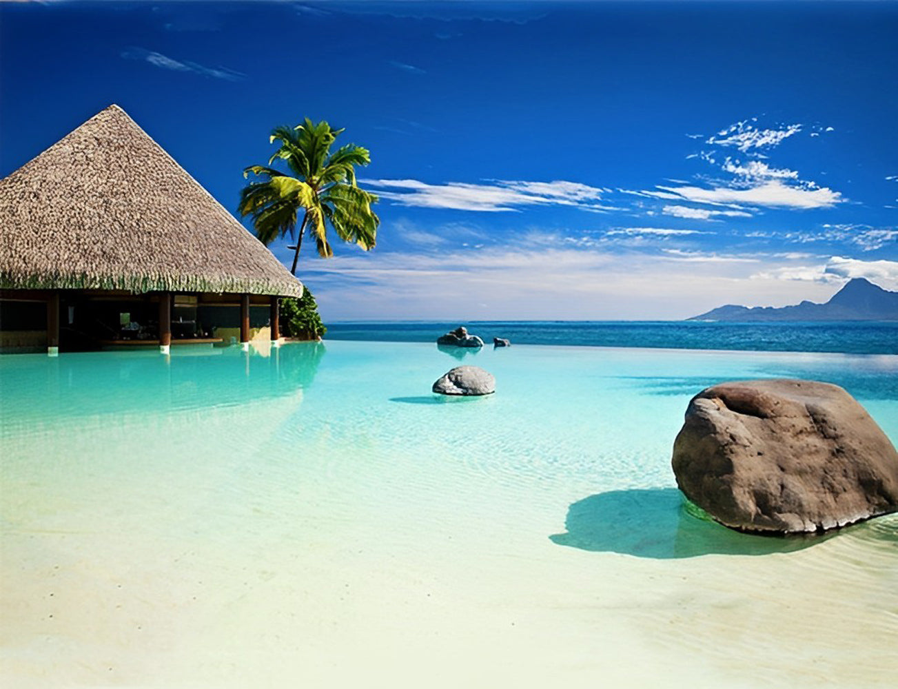 De Vredige Pracht van Tropisch Strand met Rietendakverblijf Diamond Painting