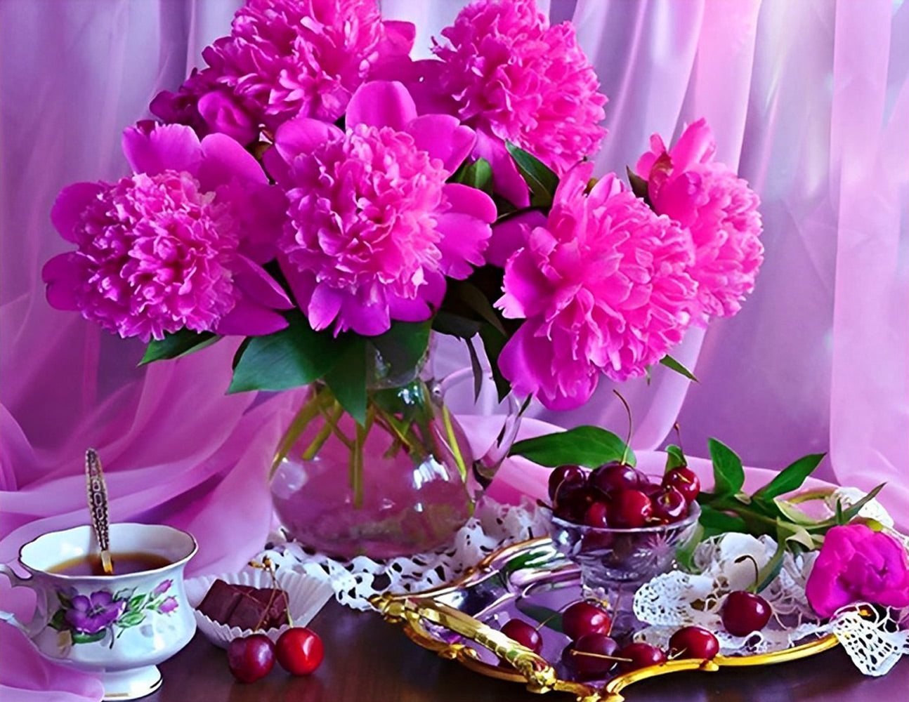 Felroze Pioenrozen met Kersen en Thee Diamond Painting